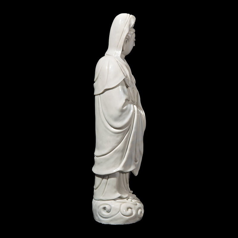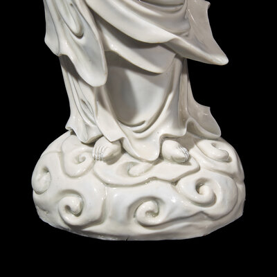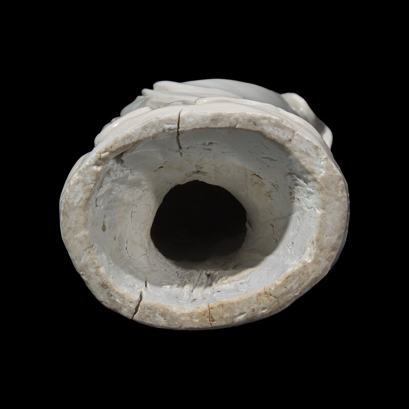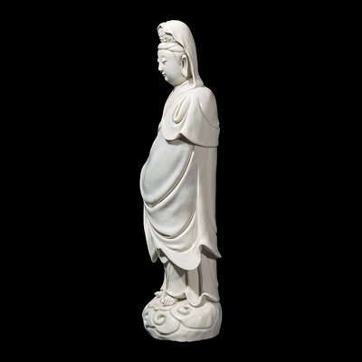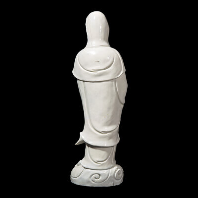 Pale as snow and glossy as jade, Dehua porcelain sculpture is renowned for these distinctive qualities. The Bodhisattva Guanyin has been one of the most important icons of Dehua porcelain, playing a significant role in both palace and non-imperial contexts during the Ming (1368-1644) and Qing (1644-1912) dynasties. The style and techniques of the Dehua kiln have evolved during the 17th century with the shift in regimes. Generally, early works from the Ming dynasty appear more solidly modeled, while those from the Qing dynasty exhibit a touch of ethereal elegance. In addition to political factors, advancements in manufacturing played a major role in execution. According to a prevalent theory, craftsmen from the Ming dynasty typically used a wood core as a foundation, applying a thick layer of paste. As a result, the mark of the wood core would be left inside the hollowed body. Qing dynasty craftsmen replaced the wood core with a mold, resulting in thinner and lighter sculptures. The present Guanyin, with its dense body but graceful form, combines features from both periods, suggesting it was likely crafted during the transitional period.