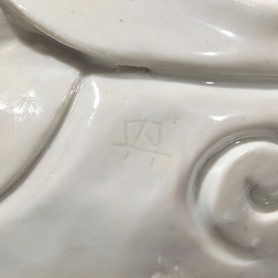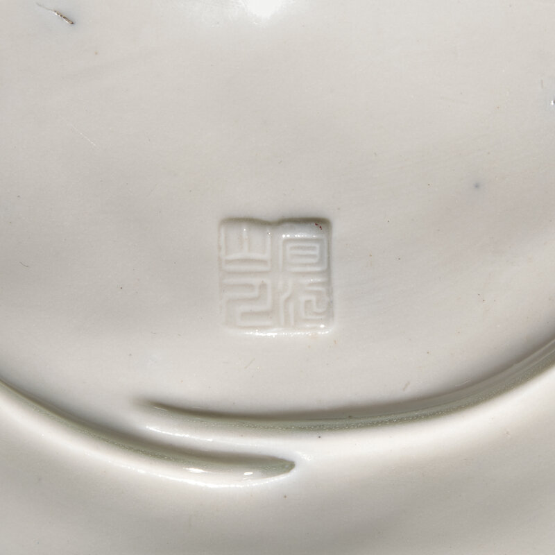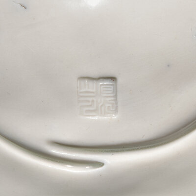 “筍江山人”款識(筍江隱士)應為孫夏瑚(1627-1707)專有,其人詩書皆富養,實為飽學之匠人,易有史考其為武德將軍者。P. J. Donnelly在Blanc de Chine (London, 1969, p. 283)一書中將此款識作者斷代於十七世紀下半葉。Blanc de Chine: The Great Porcelain of Dehua (Berkeley, 2002, p. 139)一書中,Robert H. Blumenfield不吝美言,盛讚此明末筍江山人藝伎冠絕。管窺今世館藏或重要私藏攜此款識之造像,觀音及羅漢形象佔比至高,工匠偏愛之情可見一斑。其形或立於祥雲海浪,或禪修於岩間。其功夫尤見於長袍抹胸處,寥寥數刀,卻精准無比呈現明清衣著之美,蓋無出其右者矣。類似者可參見北京故宮一樽達摩坐像(編號:新00083671),其背後印文幾乎同於是次拍品,斷代為明。同為館藏的另一件東方朔人物亦有此款,且工藝極細。另見一樽達摩造像於2008年11月5日釋出於倫敦蘇富比,拍品編號335。