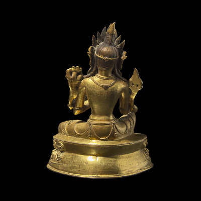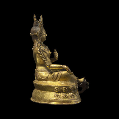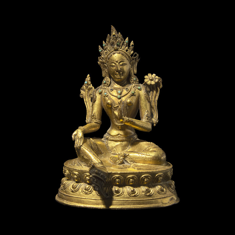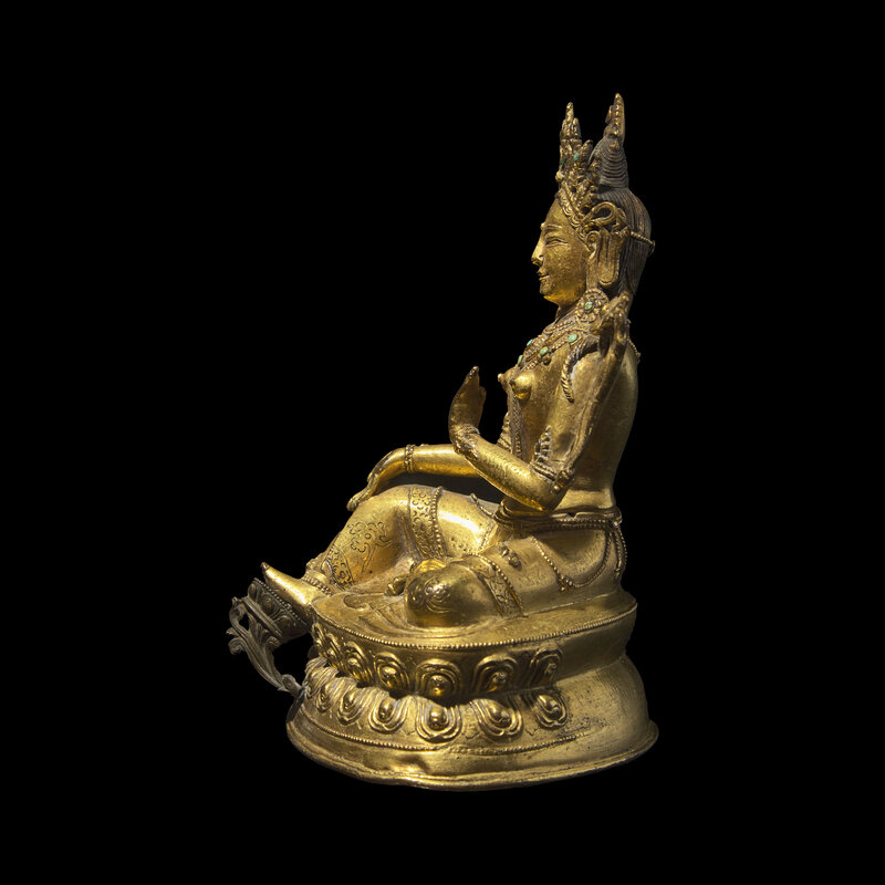 The elegant female deity seated on a lotus base, with one hand in Vitarkamudra, the other in Varadamudra, her jewelry and crown inlaid with turquoise, a flower at one shoulder, richly gilt, underside sealed. Himalayan Art Resource #13388.