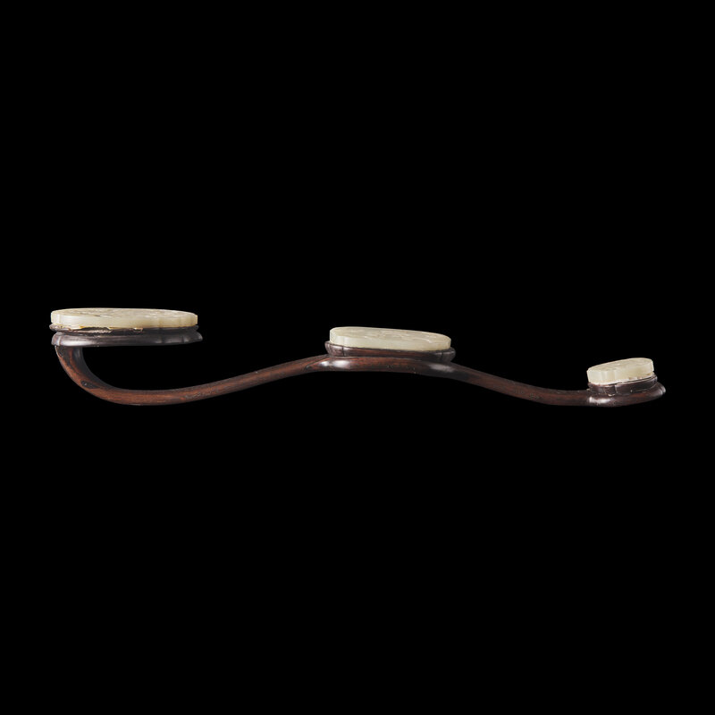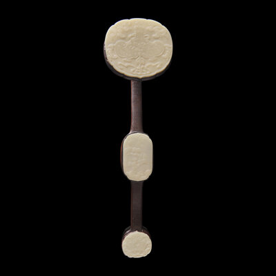 清 白玉三鑲銀絲嵌紅木如意