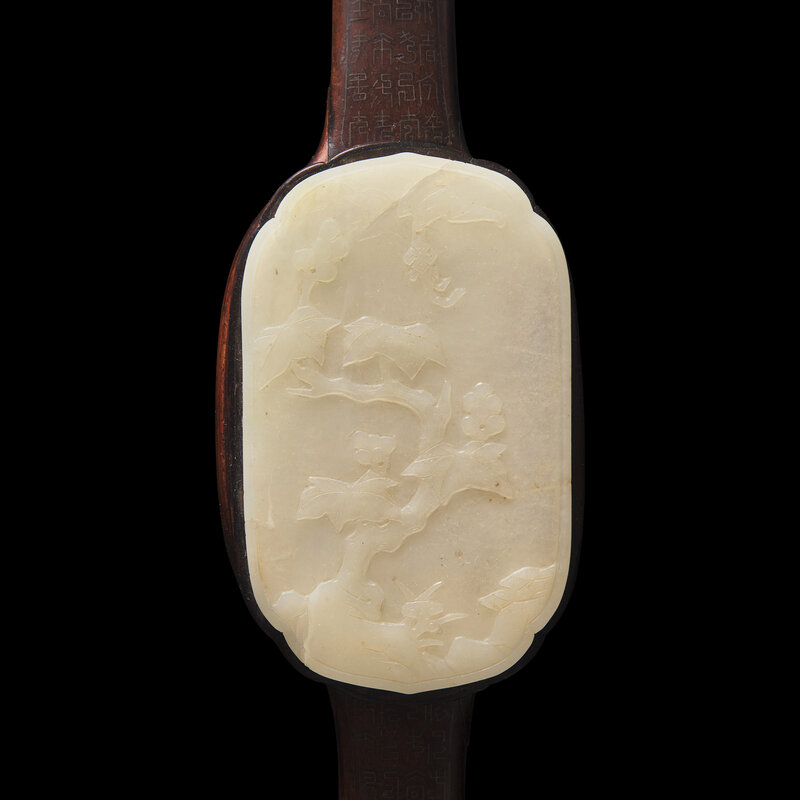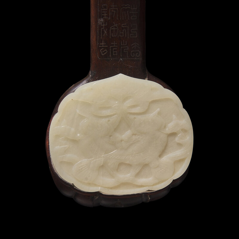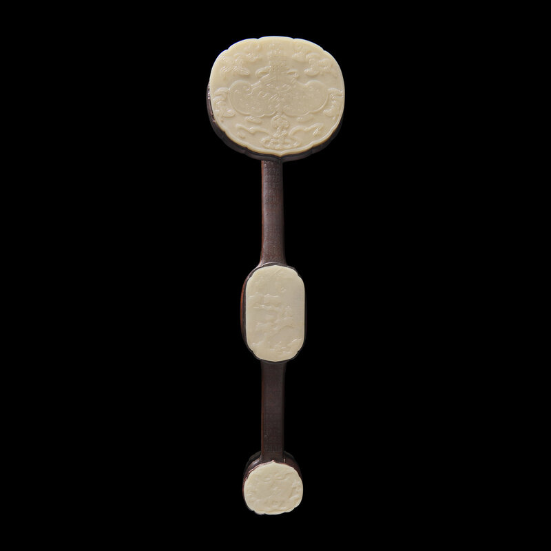 A Chinese White Jade and Silver Wire inlaid Rosewood Ruyi Scepter, Qing Dynasty