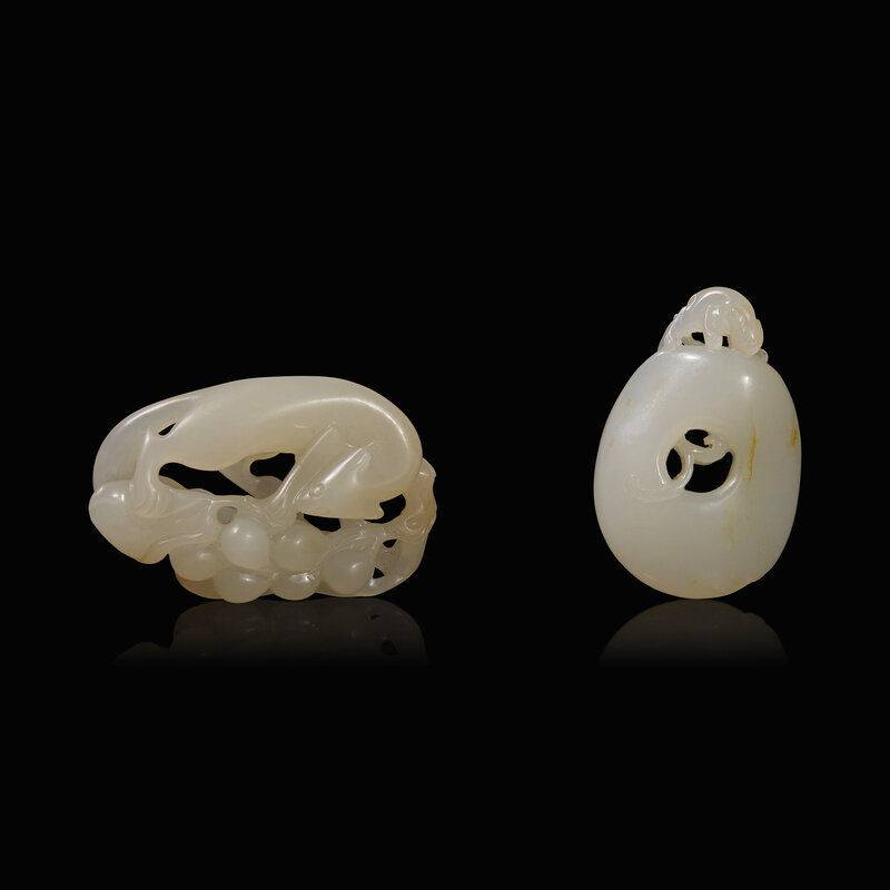 Both stones of even white tone, one carved in openwork with a squirrel clambering over grapes, the other carved with a Chilong to the top of an open ring.