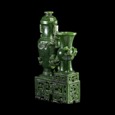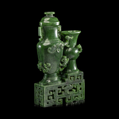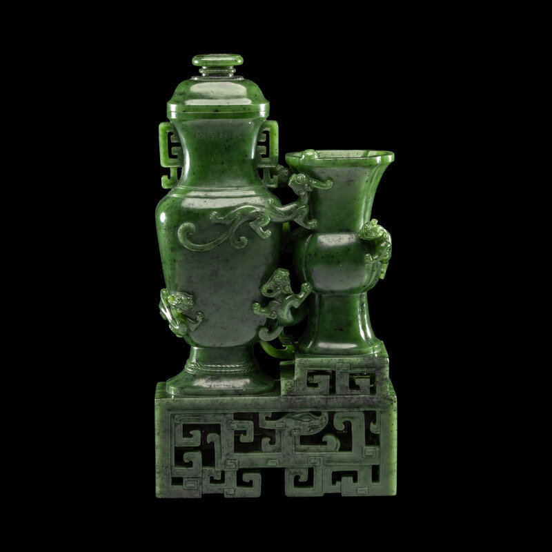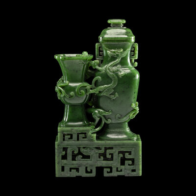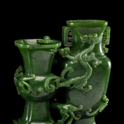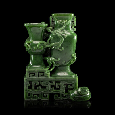 A Chinese Spinach Green Jade 'Dragon' Double Vase, Qianlong Mark