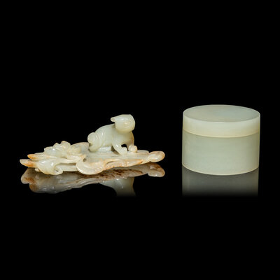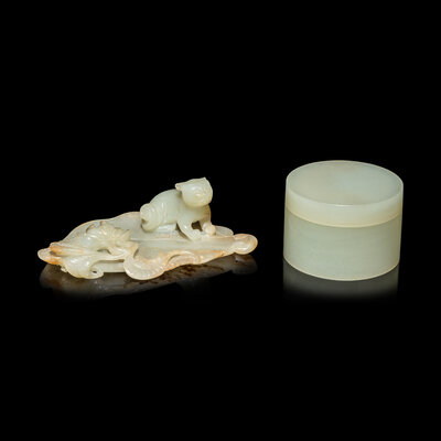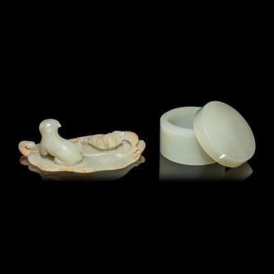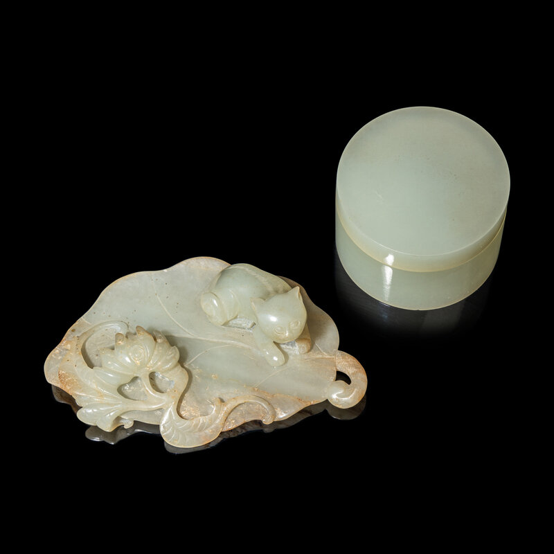 The first a leaf-form brush rest, carved in high relief showing a recumbent cat next to a lotus blossom above the large leaf, the even colored stone with minor russet skins; the second a short, cylindrical covered box with plain sides, the stone of an even pale celadon color.