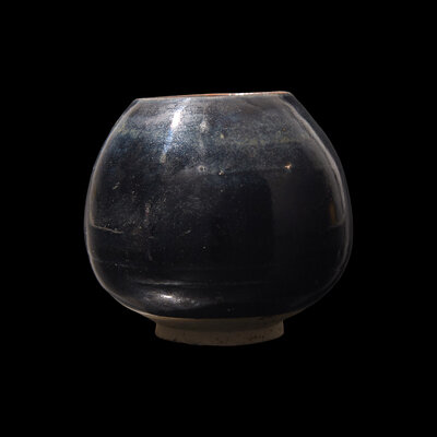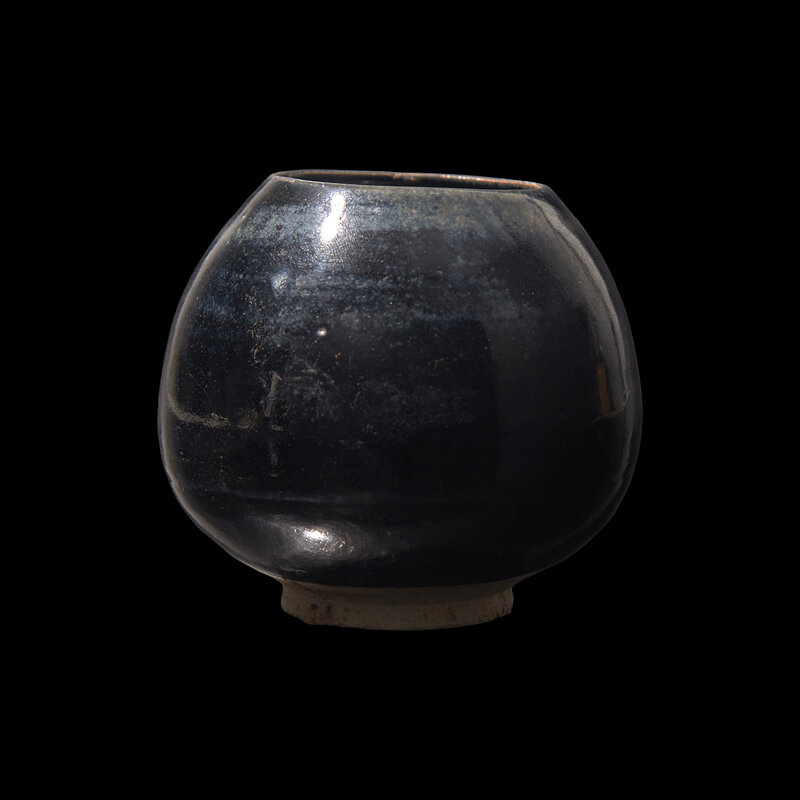 Of tapered globular form on short foot, the stoneware body with a glossy black glaze with tinges of iron brown.