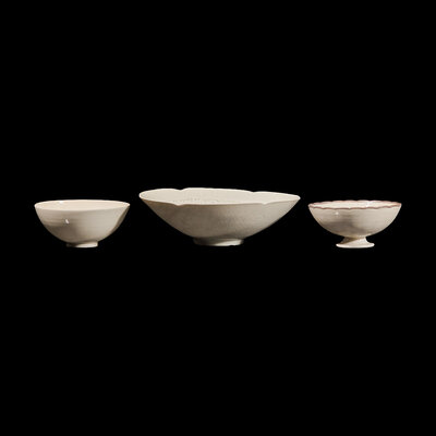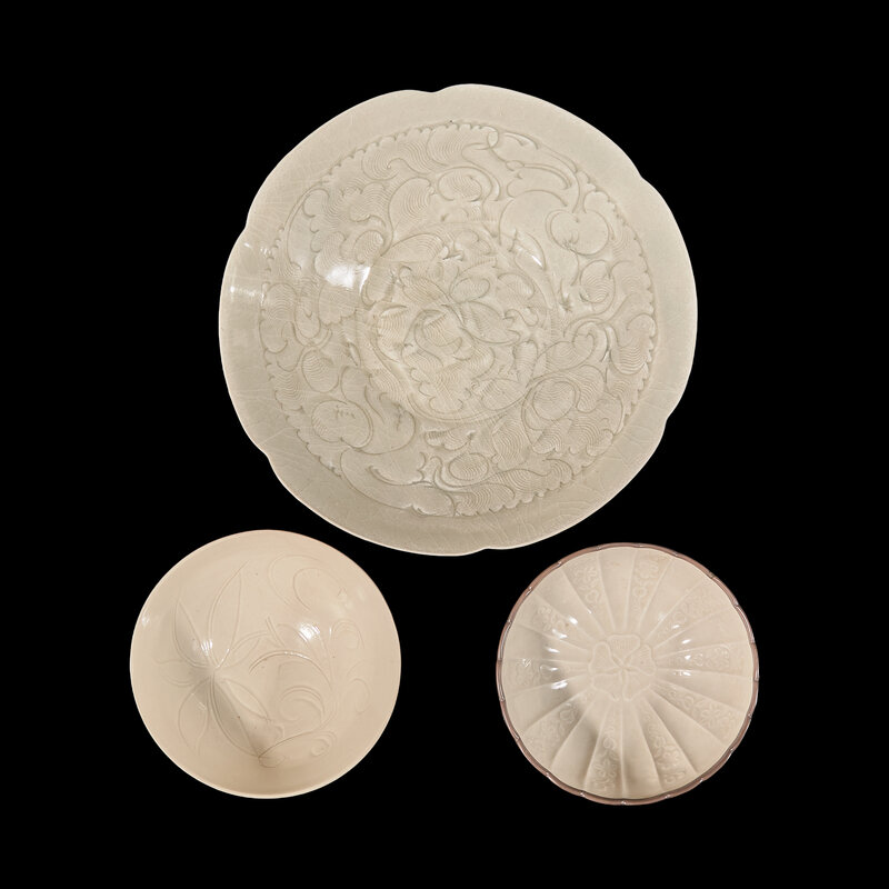 The first a hemispherical bowl on low foot, interior incised with a lotus; the second a small fluted footed bowl, the interior molded with floral and foliate motifs, centered by a five-petalled blossom, metal rim; the third a hexalobe qingbai bowl incised with stylized boys among peonies.