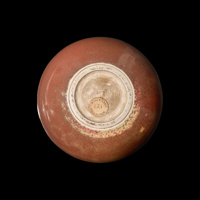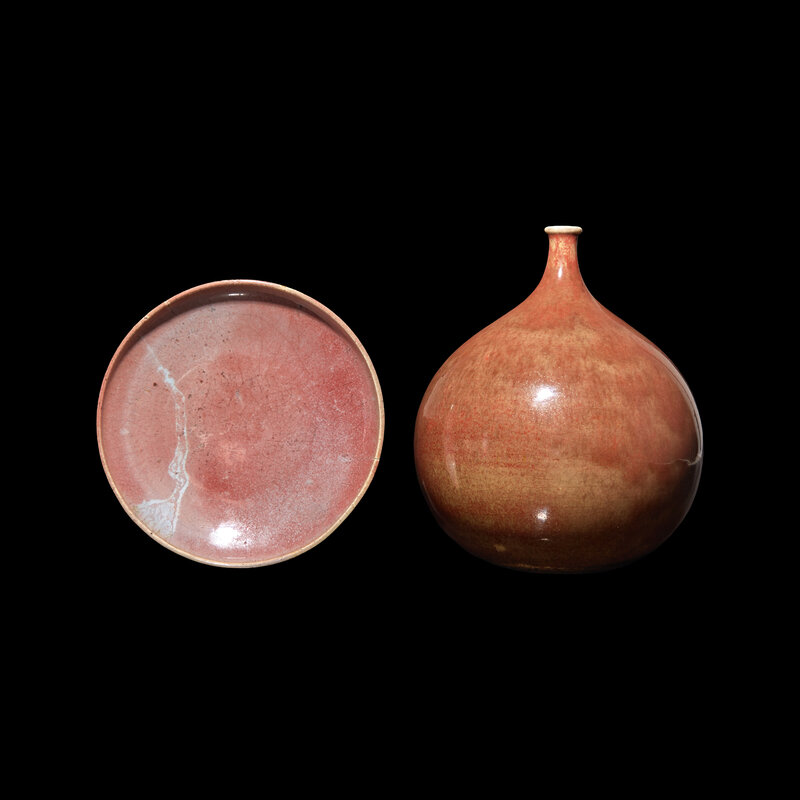 The vase of globular shape body and topped by tiny mouth, the finely-crackled glaze of a mix of red and olive green, the shallow circular dish of reddish-purple and blue glaze.