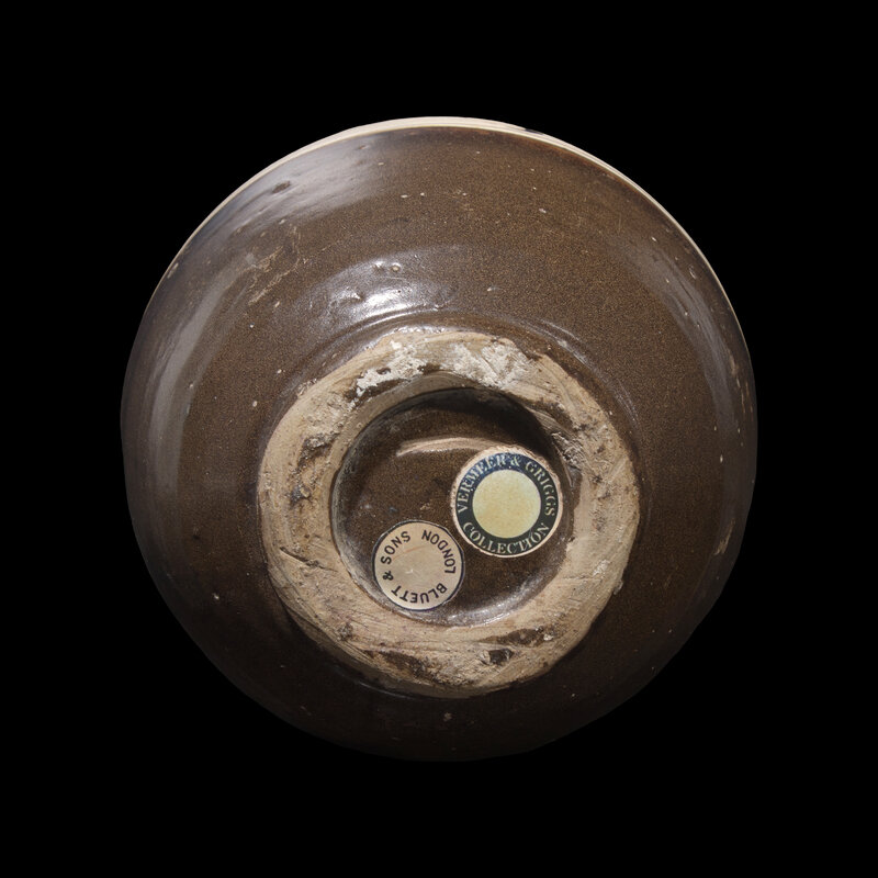The ovoid jar with four applied 'petals' at the shoulder, decorated with stylized motifs on light slip ground, the base with iron-brown glaze.