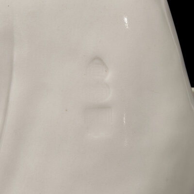 The Bodhisattva with peaceful expression, seated, in flowing robes, holding a ruyi scepter, two impressed seal marks to the back (the upper likely He..., the second indistinct.) Underside incised shun.