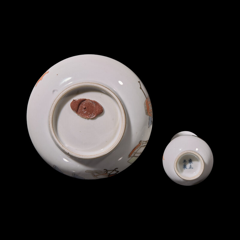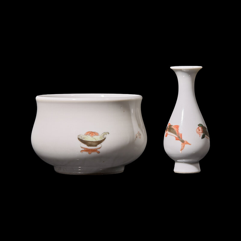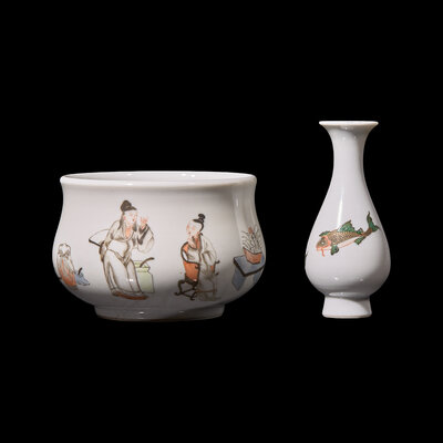 Comprising a bombe form small censer, decorated with a scholar flirting with a seated meiren, the second a pear shaped vase decorated with three fish, underside with apocryphal Yongzheng mark in underglaze blue.