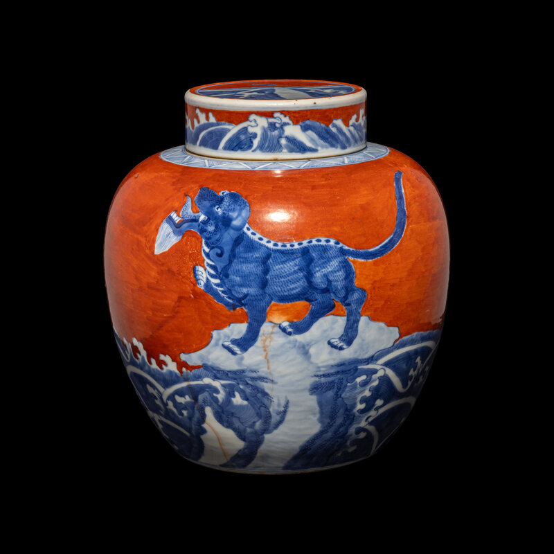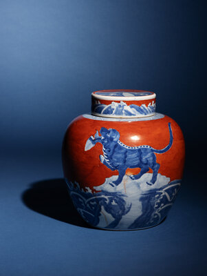 清中期 珊瑚紅地青花瑞獸圖蓋罐