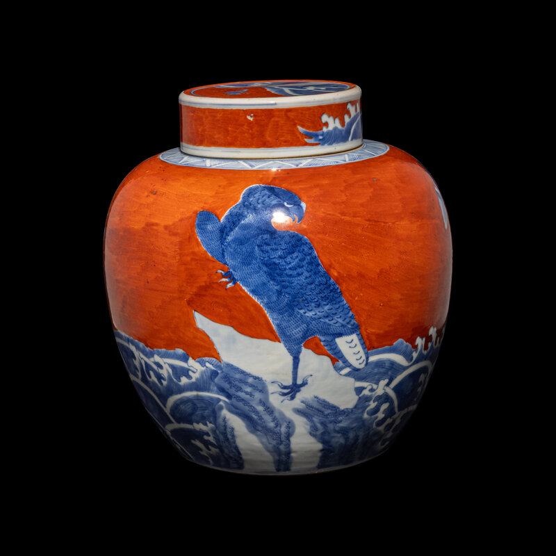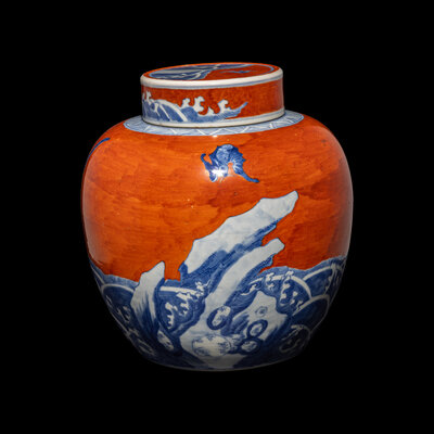 A Chinese Coral-Red Ground Underglaze Blue Porcelain Covered Ginger Jar, 18th Century