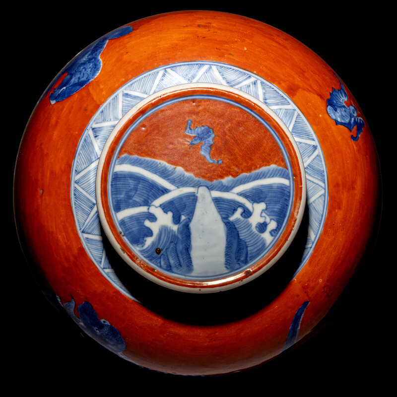 The globular body painted to show mythical beasts standing above rockworks with crashing waves underneath, the cover decorated with similar wave design, the underside bearing a Kangxi six-character mark in underglaze blue; the coral-red glaze later added.