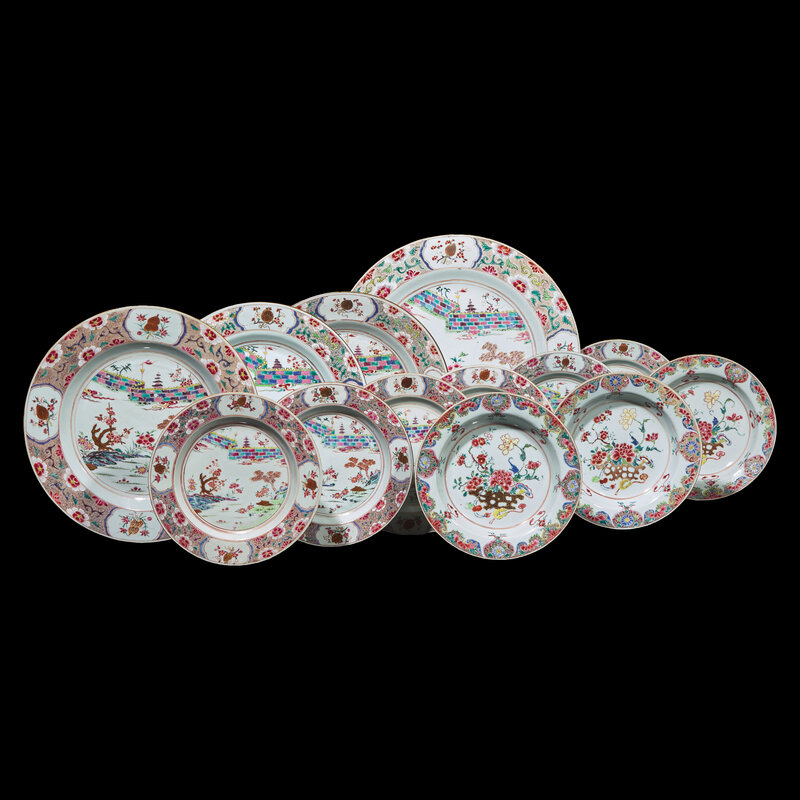 Thirteen Chinese Export Famille Rose Porcelain Dishes, 18th Century