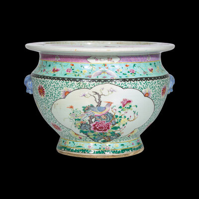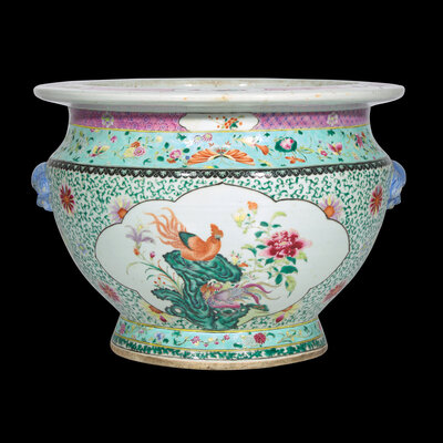 粉彩松石綠地開光牡丹雄鷄圖畫缸