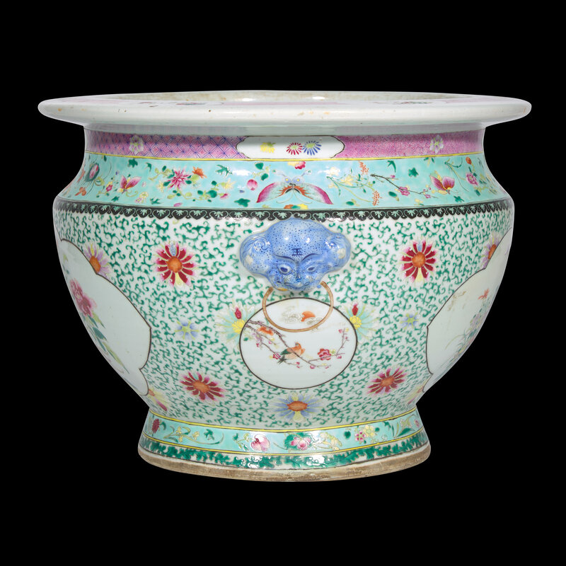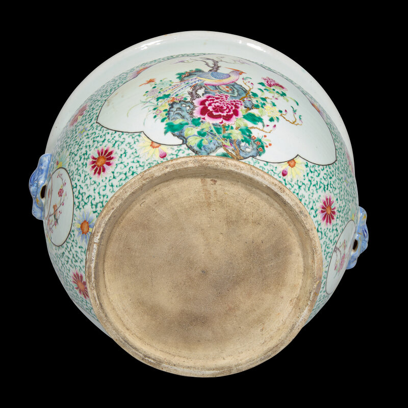 Decorated with two reserves painted with rooster and pheasant, adjacent to two small roundels of flowers, flanked by two beast head handles, and floral and foliage patterns.