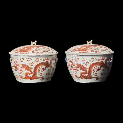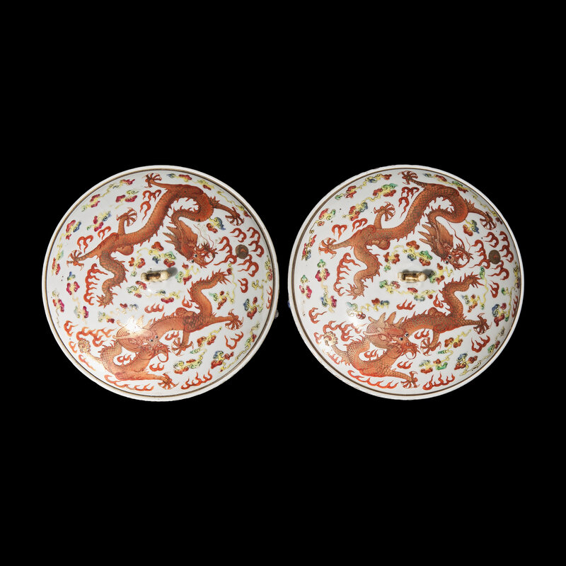 A Pair of Chinese Iron Red and Famille Rose 'Dragon' Warming Bowls and Covers, 19th-20th Century