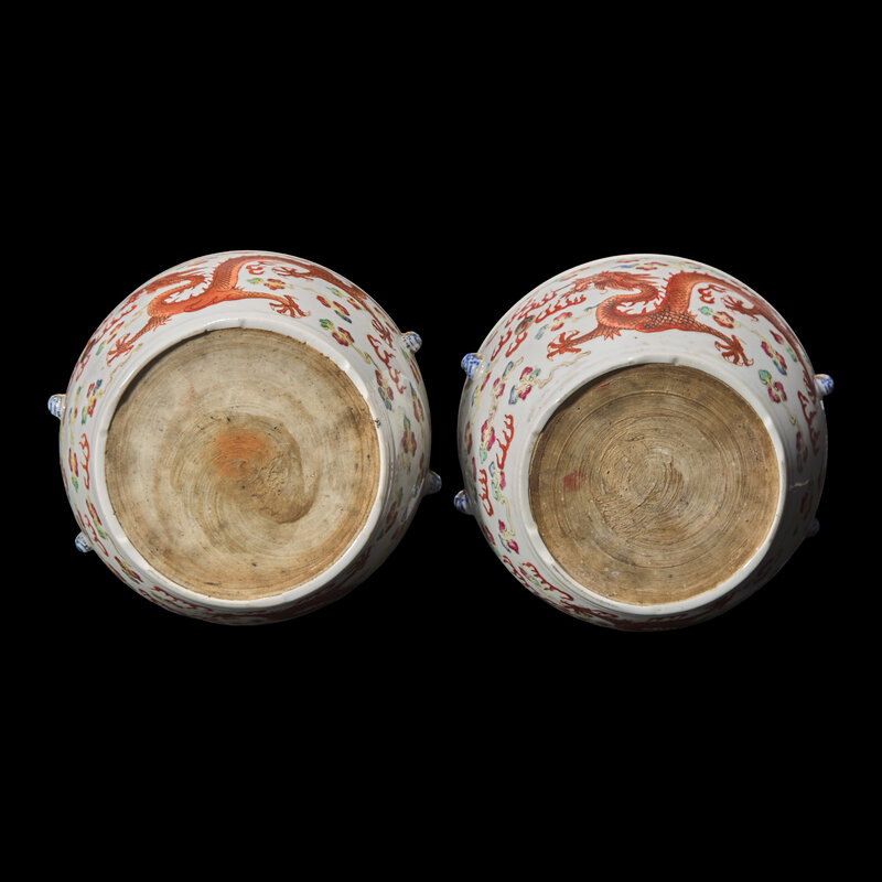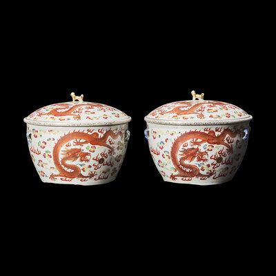 晚清-民國 礬紅彩雙龍戲珠粥罐一對