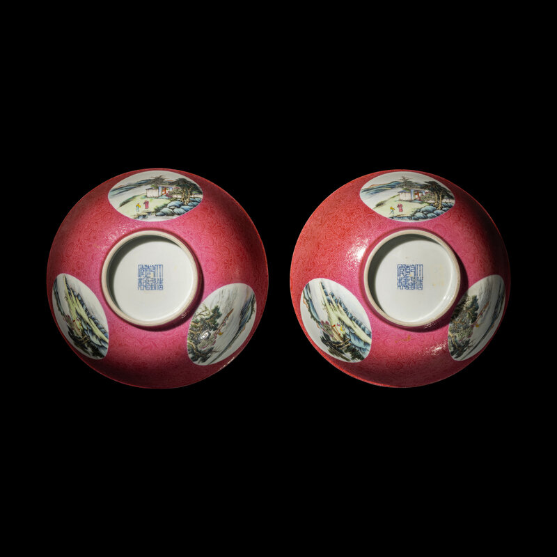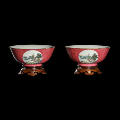 A Pair of Chinese Famille Rose Ruby Ground Porcelain 'Landscapes' Bowls, 20th Century