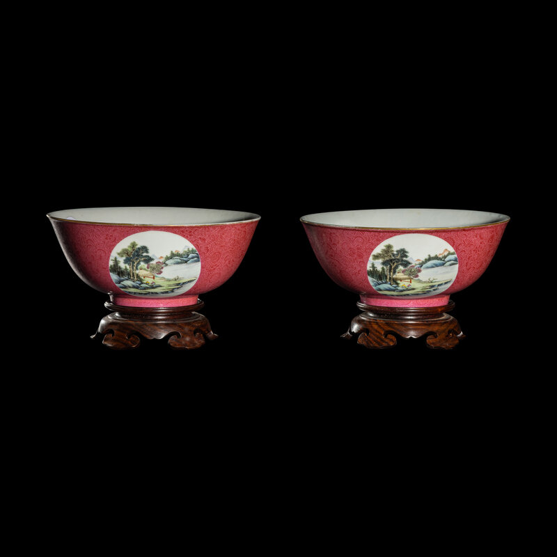 Each bowl finely decorated on the exterior with two circular panels enclosing a riverscape scene, all reserved on the ruby-pink sgraffito ground, the underside with an apocryphal Qianlong six-character mark in blue enamel, raised on a fitted hardwood stand.