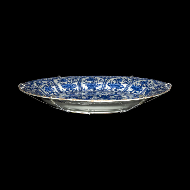 Decorated with a central-shaped cartouche enclosing lotus and branches, the rims with lobed panel decoration.
