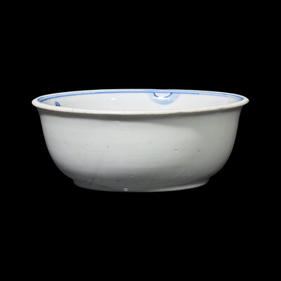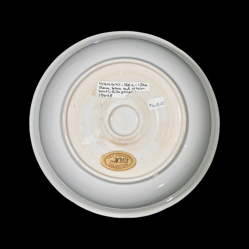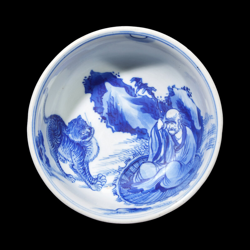 The deep bowl decorated in brilliant blue with a tiger before a seated Lohan on an oval mat before rockwork, the exterior undecorated.