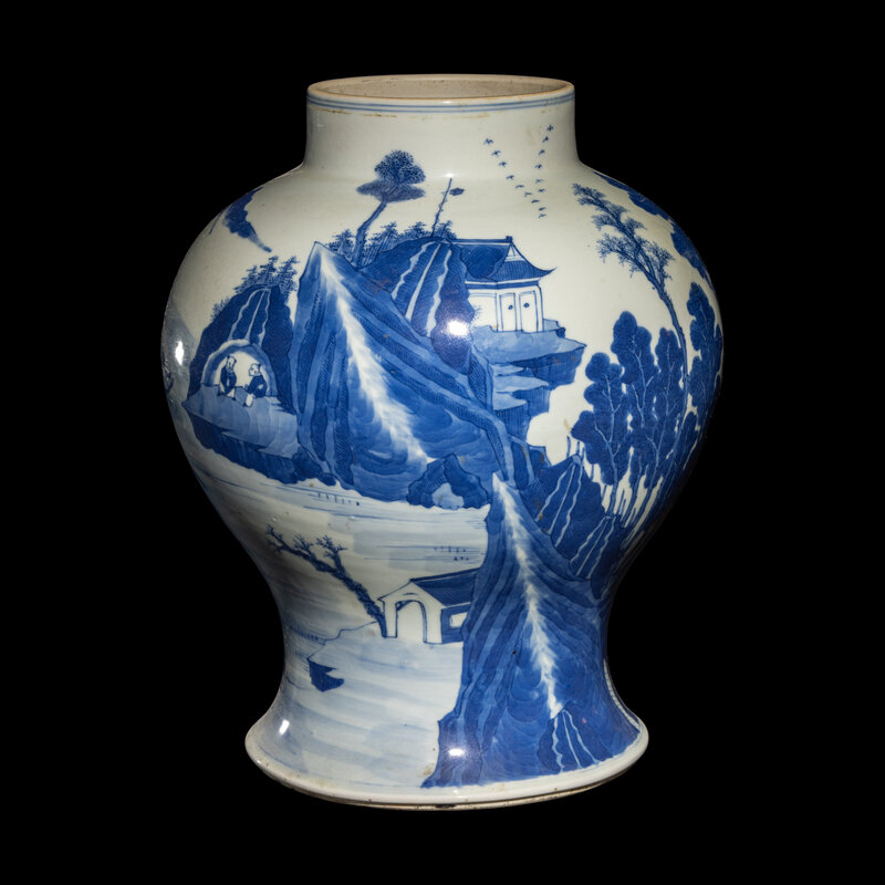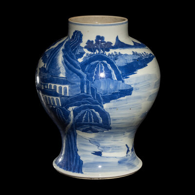 Of baluster form, painted in alternating tones of underglaze cobalt blue with a mountainous landscape.