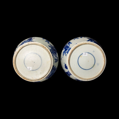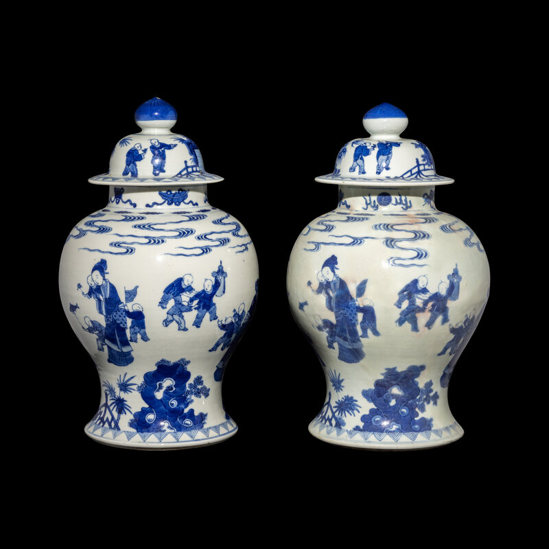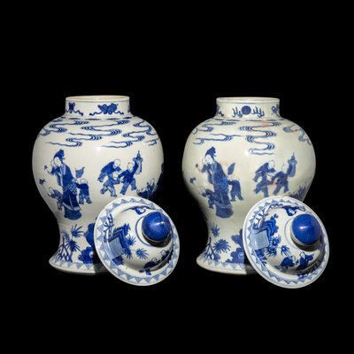 A Pair of Chinese Blue and White 'Figural' Porcelain General Jars and Covers, 19th/Early 20th Century