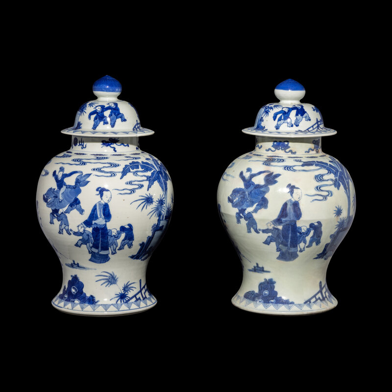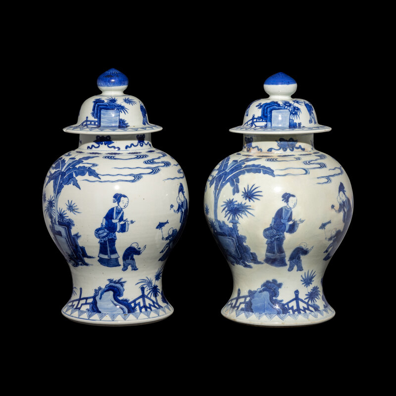Each baluster jar was painted to the exterior with a continuous scene showing ladies and boys at play in a garden underneath scrolling clouds and large plantain trees, the underside bearing an underglaze blue double ring, similar decorated repeated on the cover, surmounted by a bud-form final.