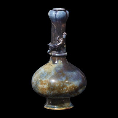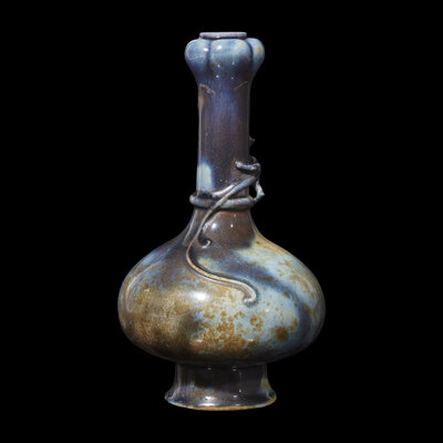 Possibly Yixing stoneware; with bulbous body, tall neck, and garlic-bulb mouth, all on a splayed foot, a sinuous qilong encircling the neck, the unglazed foot revealing a brown wash and body.
