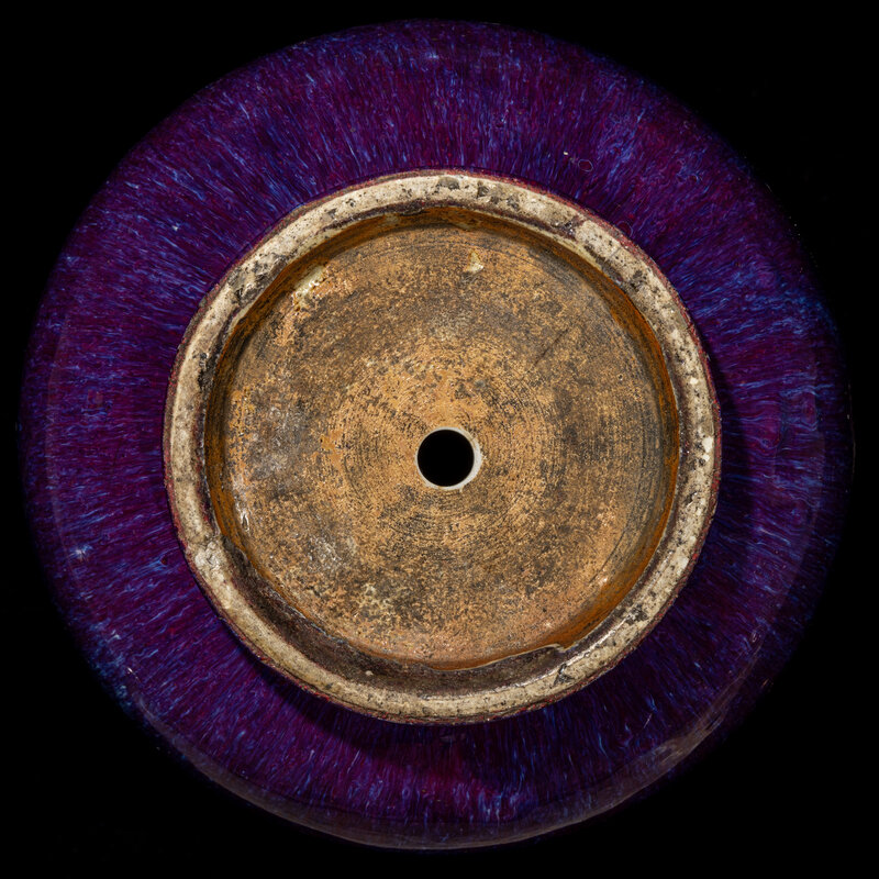 The ovoid body rising to an elongated neck, supported on a short, straight foot ring, overall covered in a dark burgundy glaze with bright blue streaks.