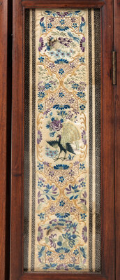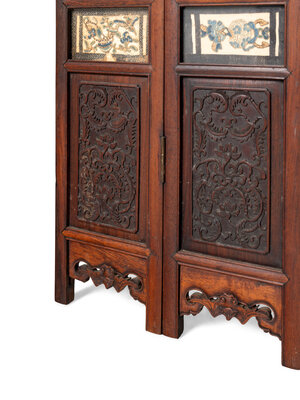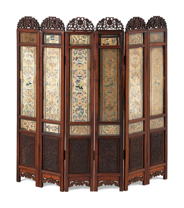 A Chinese Embroidered Silk Inset Hardwood Six-Panel Screen, Late Qing Dynasty