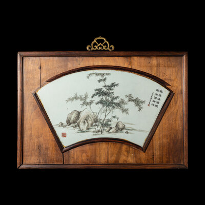 A Chinese Qianjiang Enameled 'Bamboo and Rock' Porcelain Plaque Inset Hardwood Panel, Dated 1921