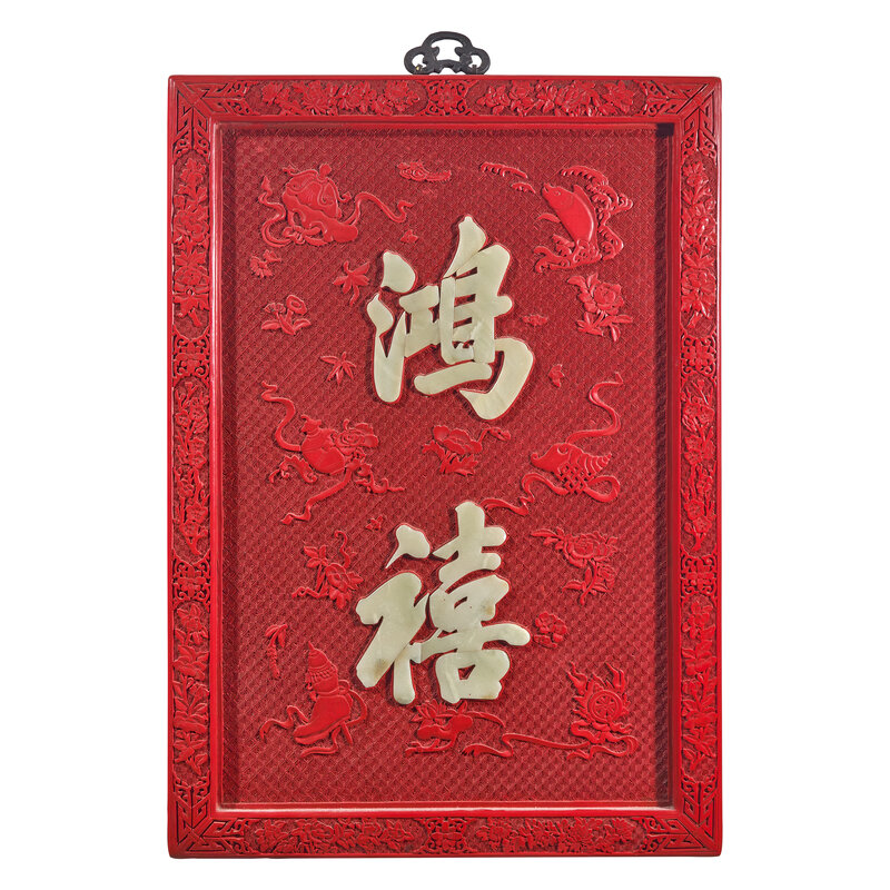 One inset with celadon jade calligraphic characters Hongxi, among Buddhist symbols and diaper, floral borders, and the other plaque carved with the characters Jie Fu, among clouds and Buddhist symbols.