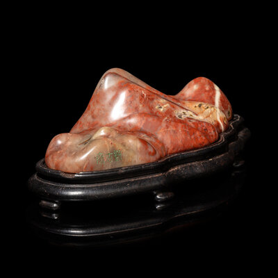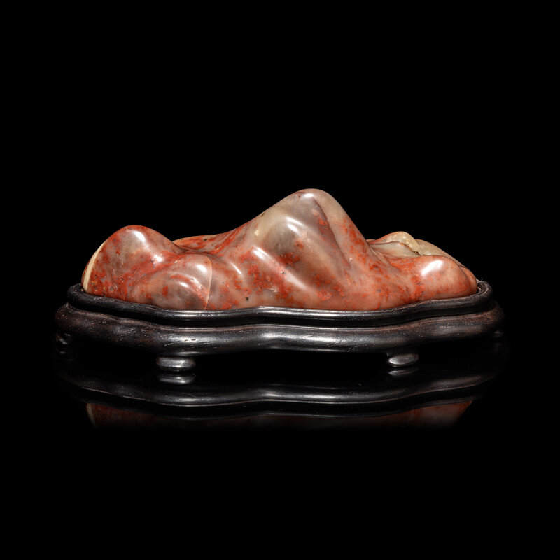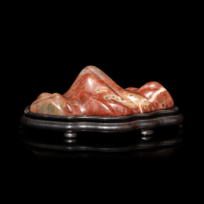 The mottled stone is naturalistically carved in the form of a mountain, raised on a fitted hardwood stand.