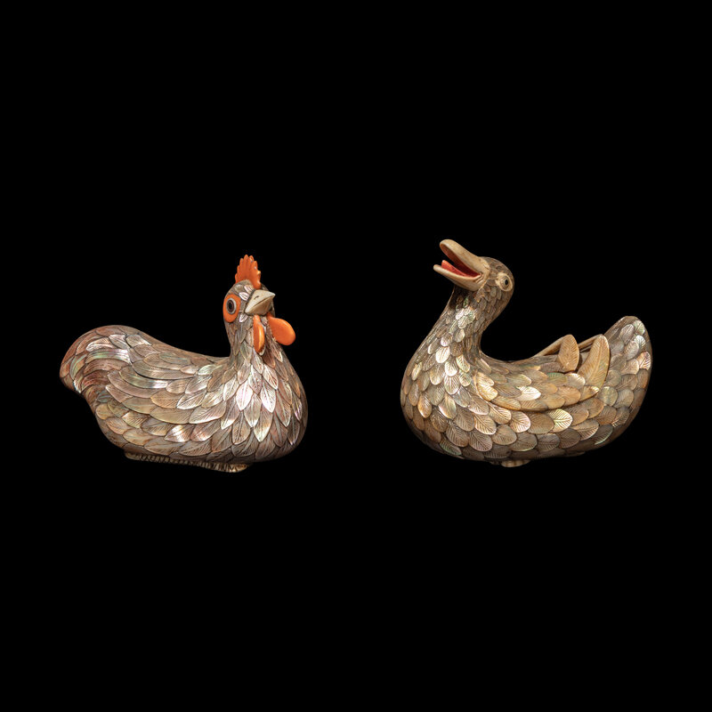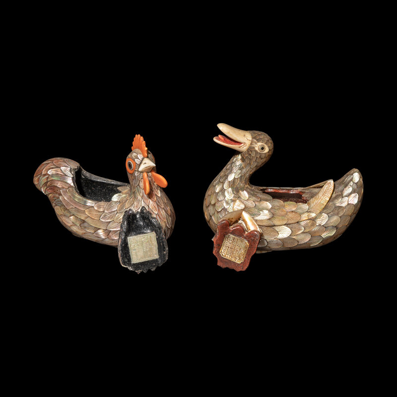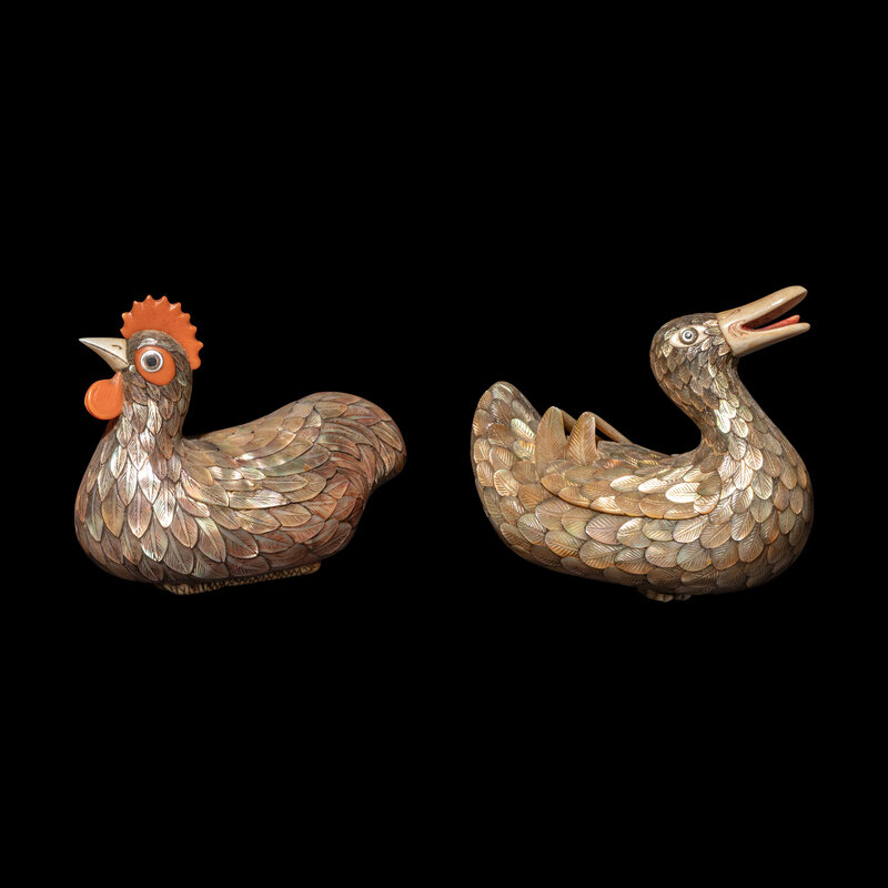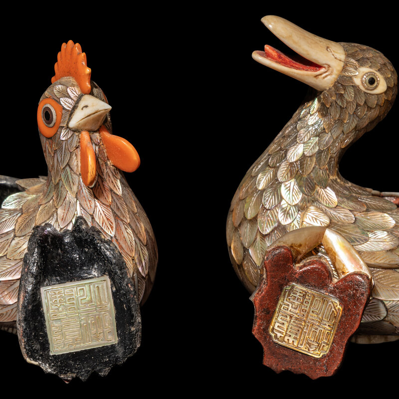 晚清/民國 乾隆御製款嵌螺鈿雞鴨蓋盒一對