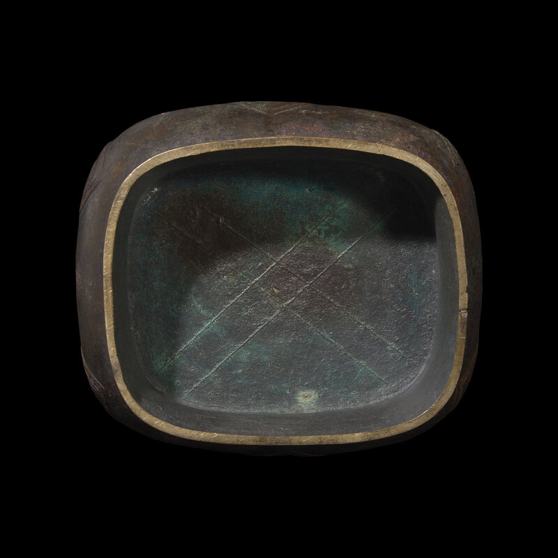 Decorated with taotie masks and stylized lappets, the handles with beast heads, the underside with cast linear motifs, and mottled green, brown, and beige patination.