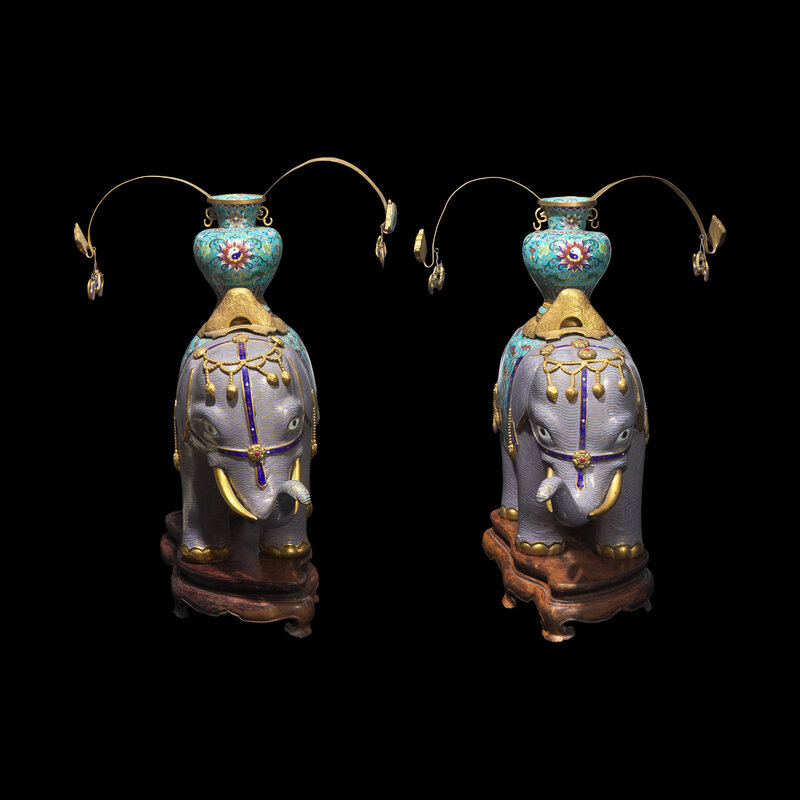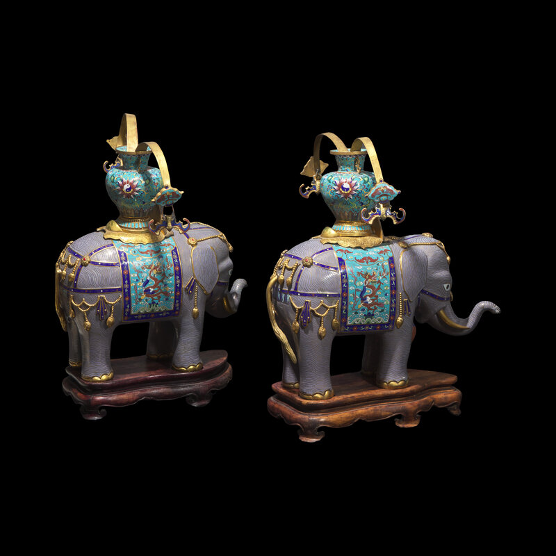 Each caparisoned pachyderm bearing a vase 'containing' stylized ruyi scepters and pendant bats, the saddle blankets with writhing dragons above waves, bats above; carved wood stands.