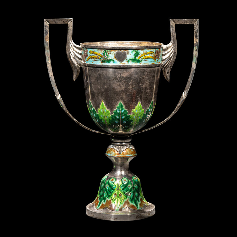 Of vase form, the spreading circular foot enameled with a band of green leaves, the lower body above a circular knop and enameled with further green leaves, the upper border inscribed and enameled red with two horizontal lines of inscriptions, underneath a blue, green and yellow enameled band each side chased with pairs of floral stems flanking a shield, with two angular side handles each ending in a leaf-form terminal.