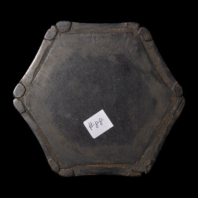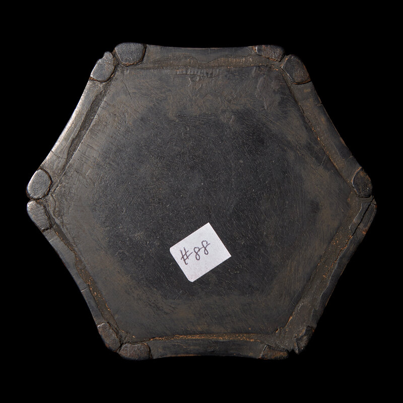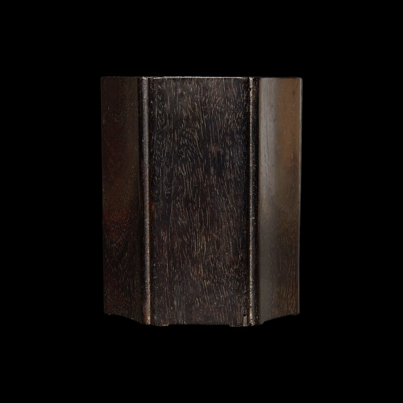 Composed of six gently curved joined vertical sides, the dark brownish-black wood with fine grain and wiry texture.