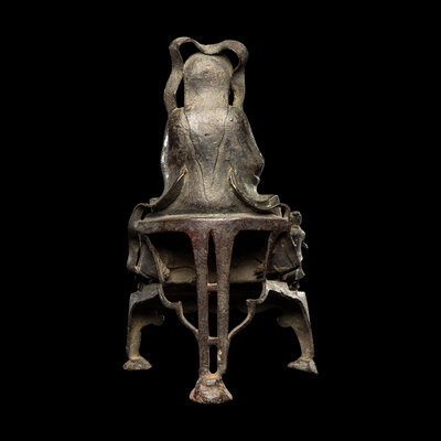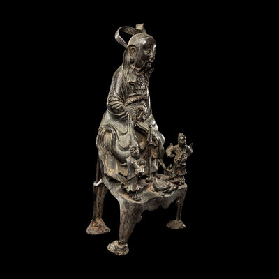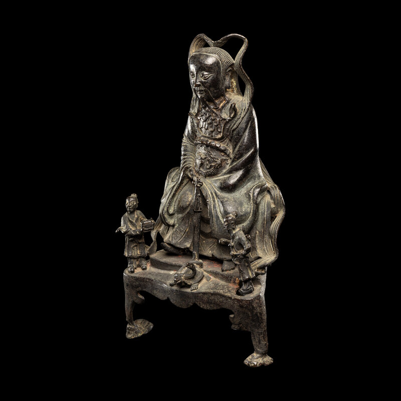 The figure cast seated on a raised stand, dressed in full armor, two attendants standing at front flanking a sword standing above a snake and a tortoise.