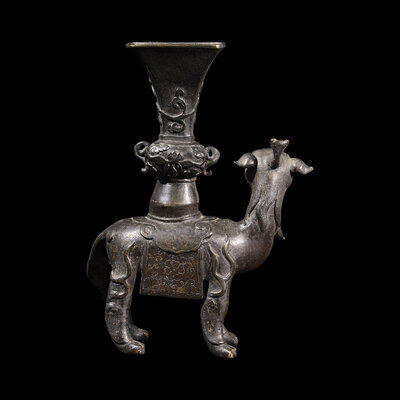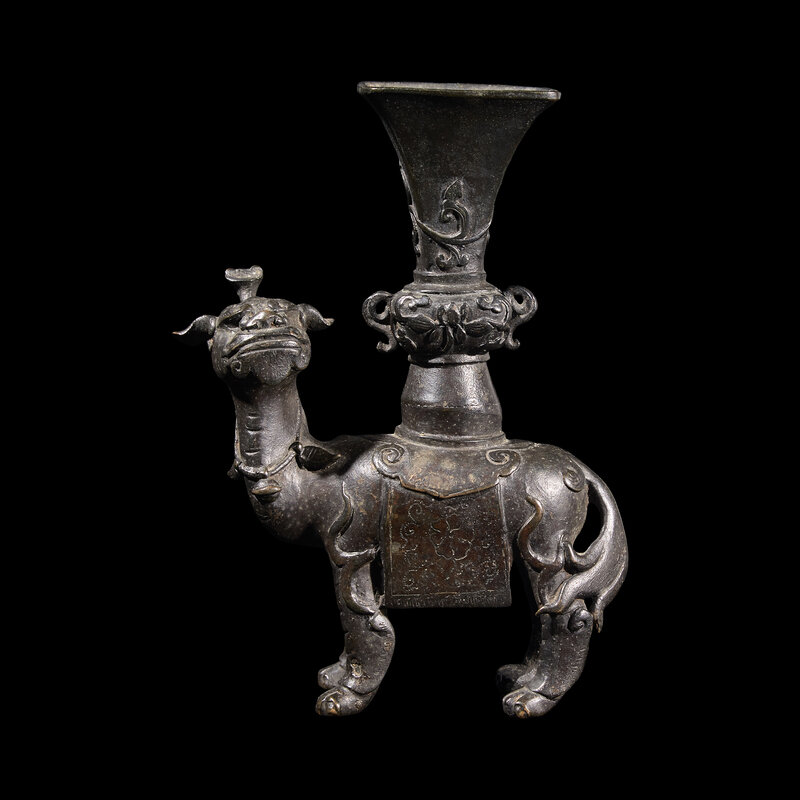 The engaging beast standing four-square with a gu form vase on his caparisoned back, dark brown-black patina.