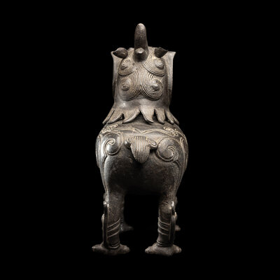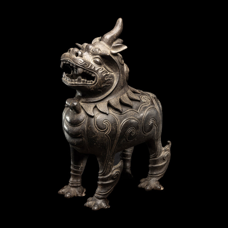 The censer cast in the form of a luduan standing with the mouth wide open revealing sharp fangs. The hollow body cast with ruyi clouds on the sides. raised on a fitted hardwood stand.