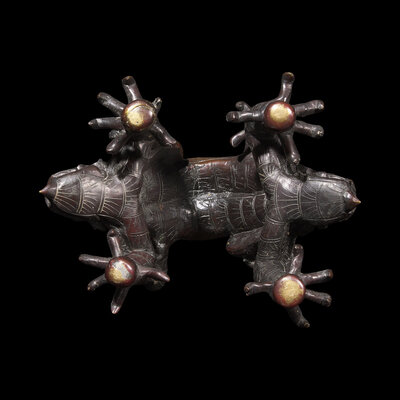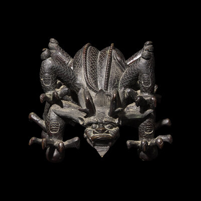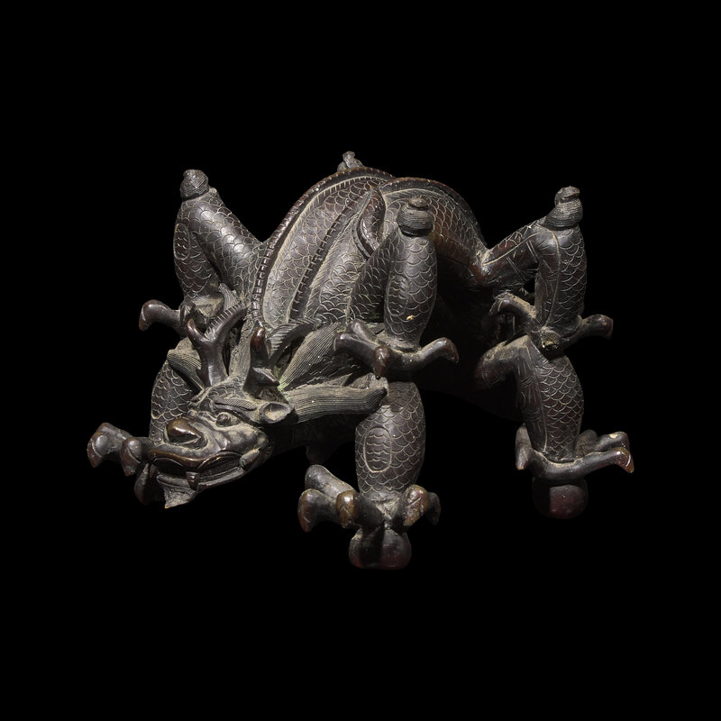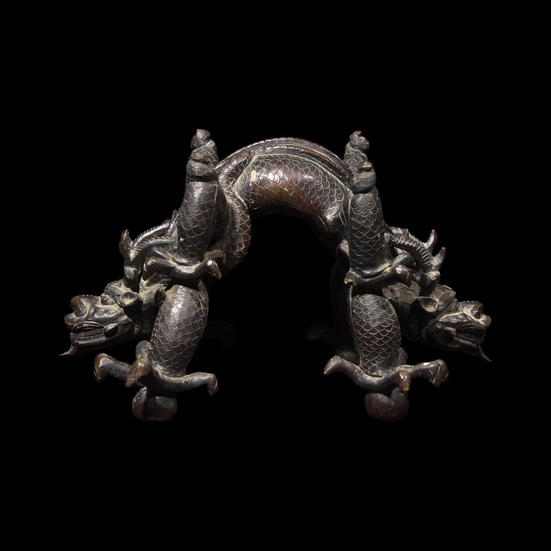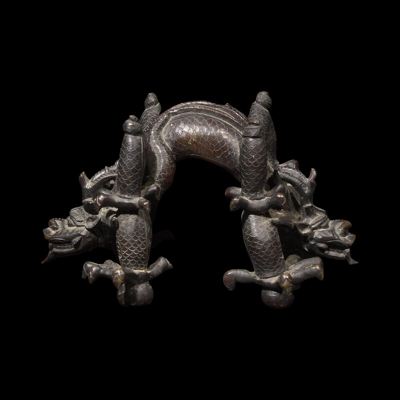 Heavily cast, in the form of two intertwined fierce five-clawed dragons with arched back, dark brown-black patina
