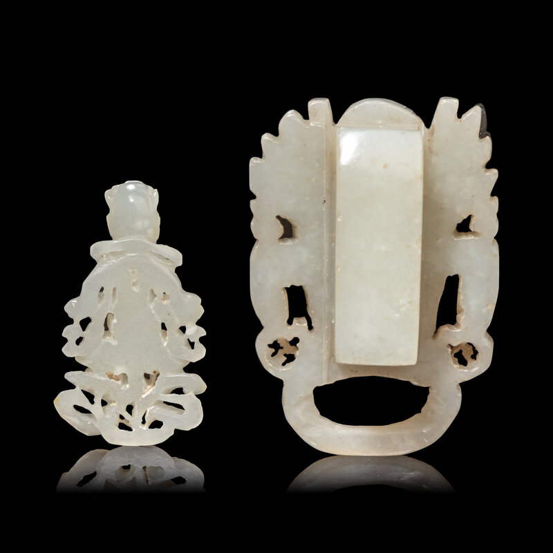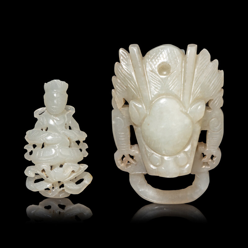 The first a reticulated figure of a bodhisattva carved seated in dhyanasana on a lotus base, the second a belt hook carved and decorated with a large dragon head.
