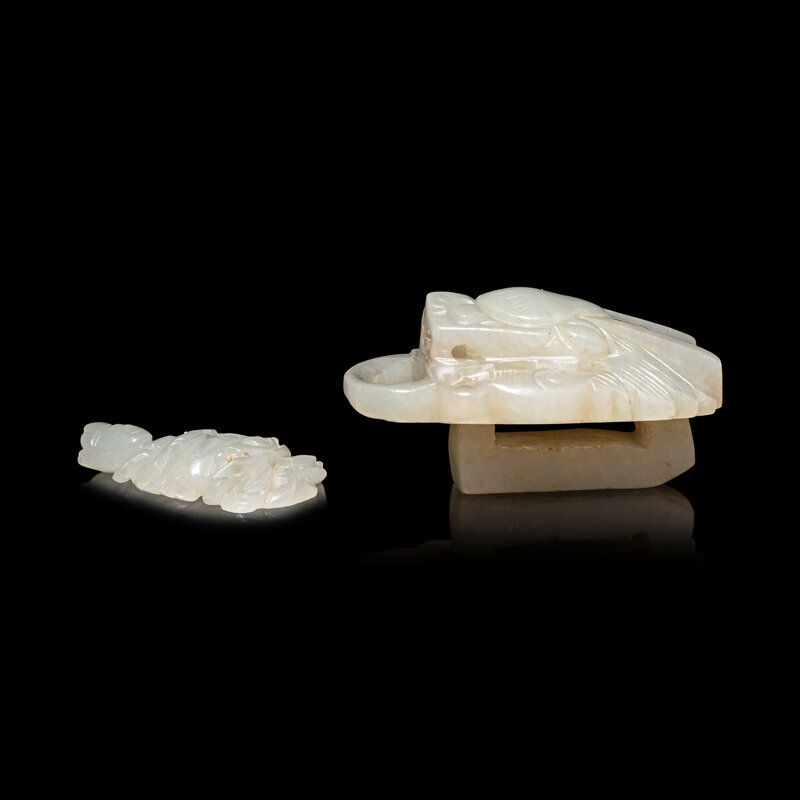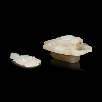 A Small Chinese Pale Celadon Jade Figure of a Bodhisattva and a Celadon Jade 'Dragon' Belt Hook