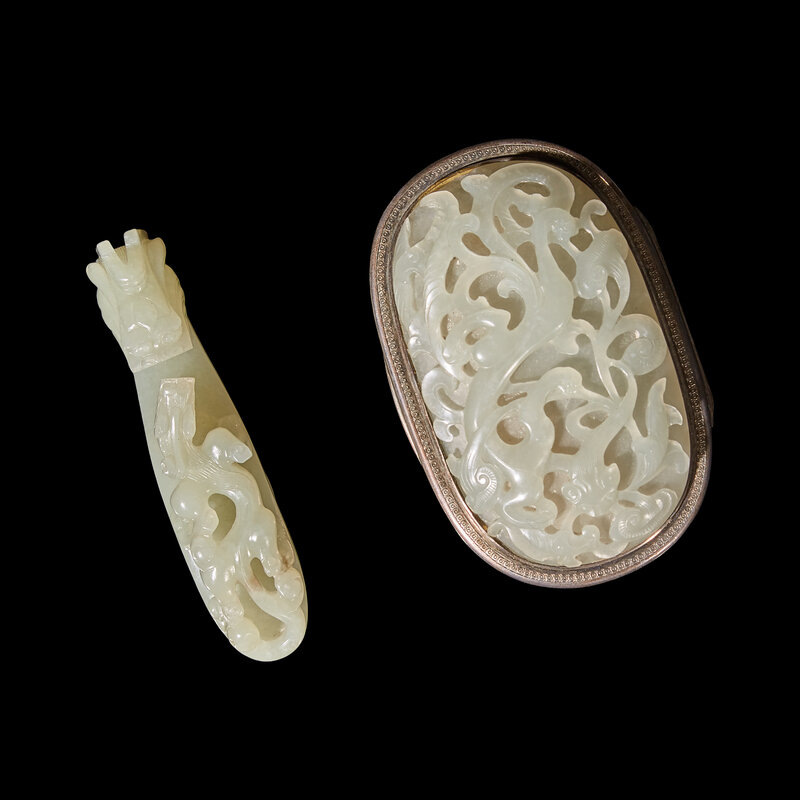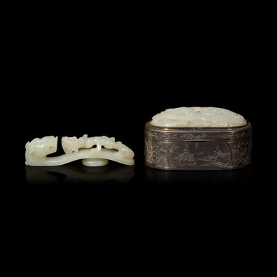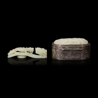 A Chinese Carved Jade Plaque-Inset Silver Box and a Jade 'Dragon' Belt Hook, 18th/19th Century