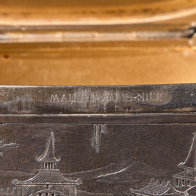 The French chinoiserie silver box fully incised with "Shou" characters, flowers, bamboos, landscapes, and inscribed Maquet-Paris-Nice, on the flange, the Chinese jade plaque to the top showing a striding Chilong holding lingzhi in his mouth; the jade hook carved in classical subject of two dragons facing each other, the stone of even pale-celadon tone.