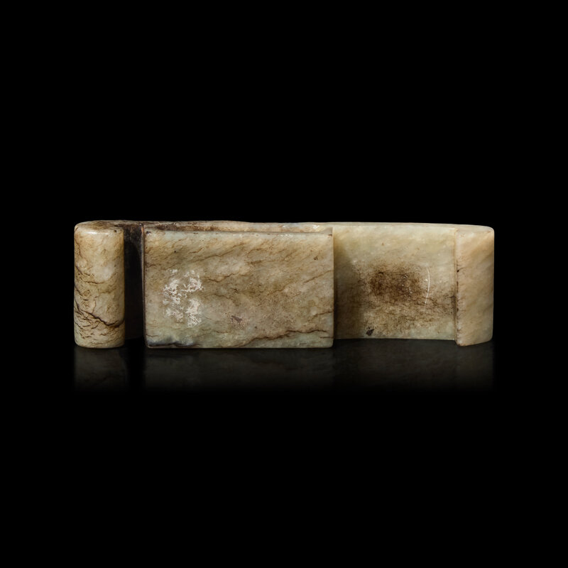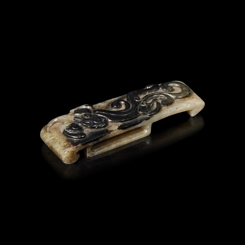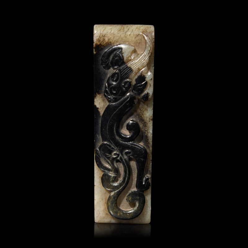 A Chinese Celadon and Black Jade 'Chilong' Sword Scabbard, Jianzhi Qing Dynasty or Earlier