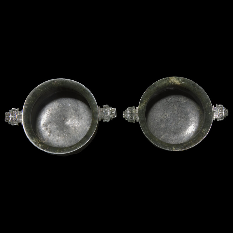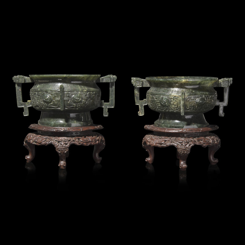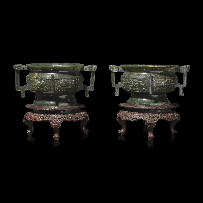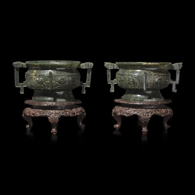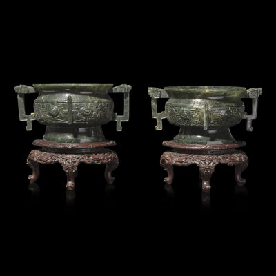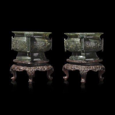 An Associated Pair of Chinese Spinach Green Jade Archaistic Censers, Gui